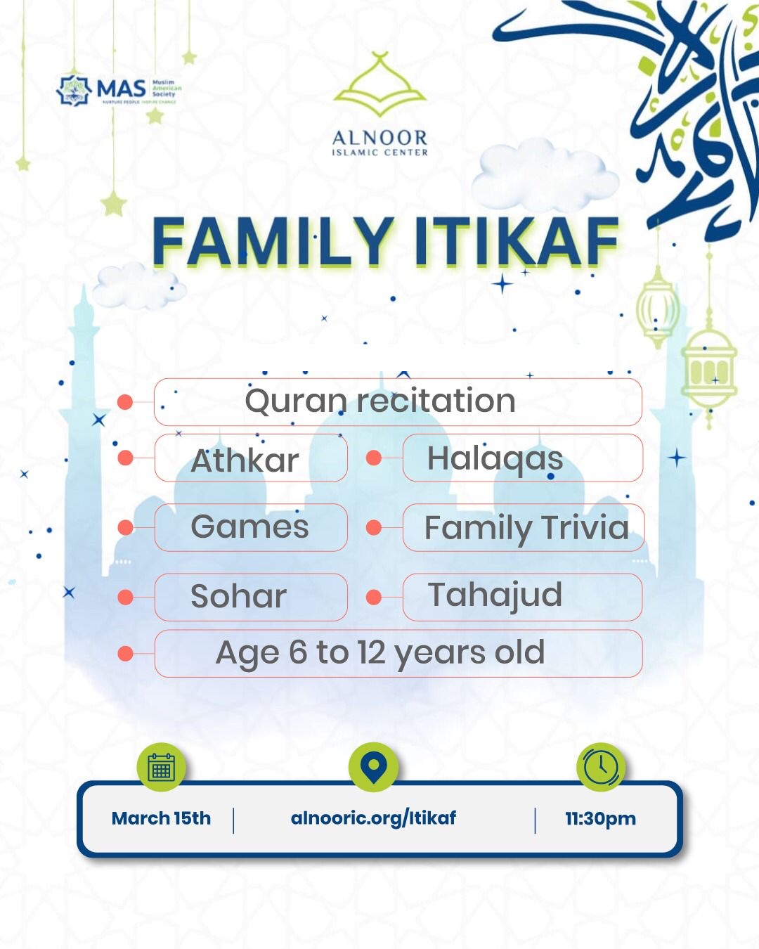 Join us in our family Itikaf on March 15th. Kids age from 6 years old to 12 years old. There will be different activities for all ages and parents too InshaAllah. | |