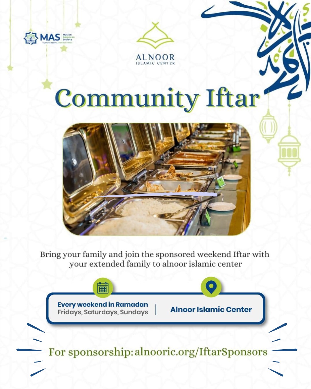 Bring your family and join the sponsored weekend Iftar with your extended family from the community at Alnoor Islamic Center