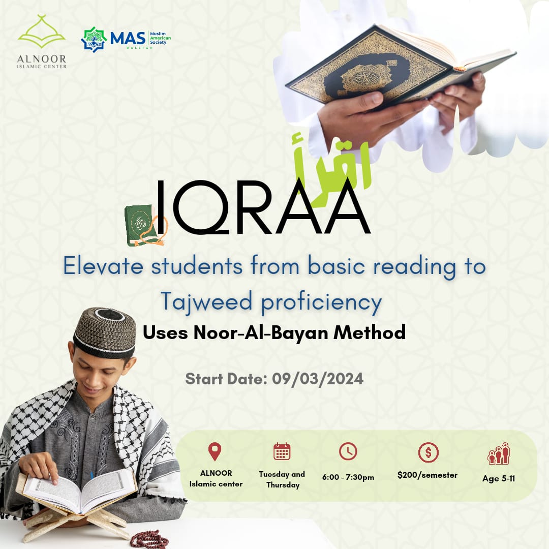 About Iqraa after-school program at Alnoor Islamic Center, we focus on taking our students from reading level to Tajweed Level InshaAllah. 1- Arabic: Mastering Arabic reading skills using the Noor-Al-Bayan Method and stepping them up to the Tajweed level. 2- Quran & Islamic Studies: We utilize certain Surahs and Ahadith to practice reading skills and teach our kids core things about their deen depending on their level Check out our last year's Summary Video: Watch Here