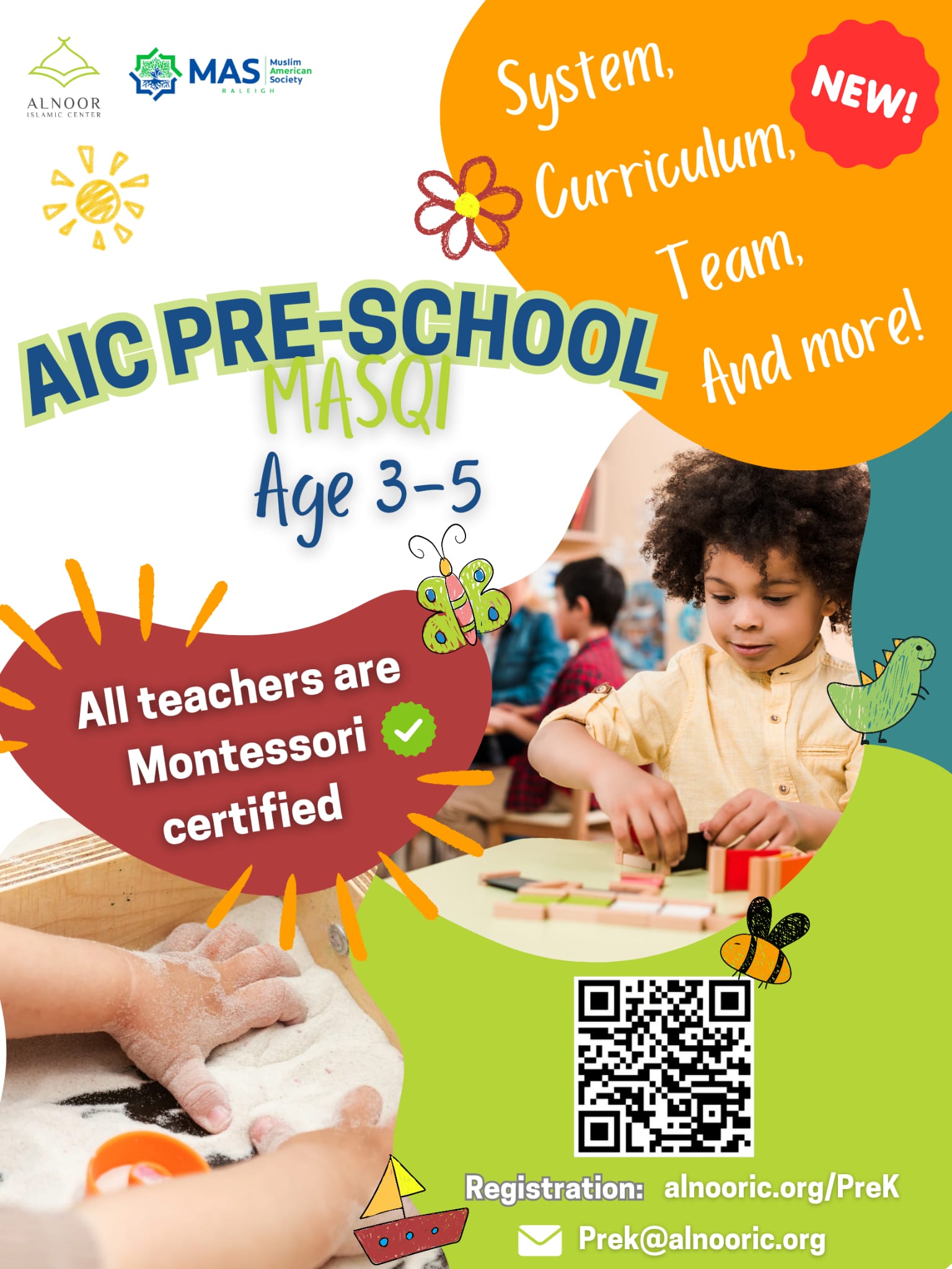 About: At AIC Preschool we utilize Montessori approach to teach our students through MONTESSORI CERTFIED TEACHERS. Our curriculum focus on these Main Areas: Quran Islamic Studies Math Practical Life Sensorial Skills English Language Arabic Language Cultural Studies Schedule: School starts on 8/27/2024 and ends on 5/30/2024 with multiple options through the day: Tuition: - $50 Non-Refundable Registration Fees (Paid upon the submission of this form). - $150 One-Time Annual Material Fees (Paid at the begining of the year). A- Half Day 08:30 AM - 12:30 PM Monday - Friday ($420) B- After Hours 12:30 PM - 03:00 PM Monday - Friday ($230) C- (A+B) Monday - Friday ($530)