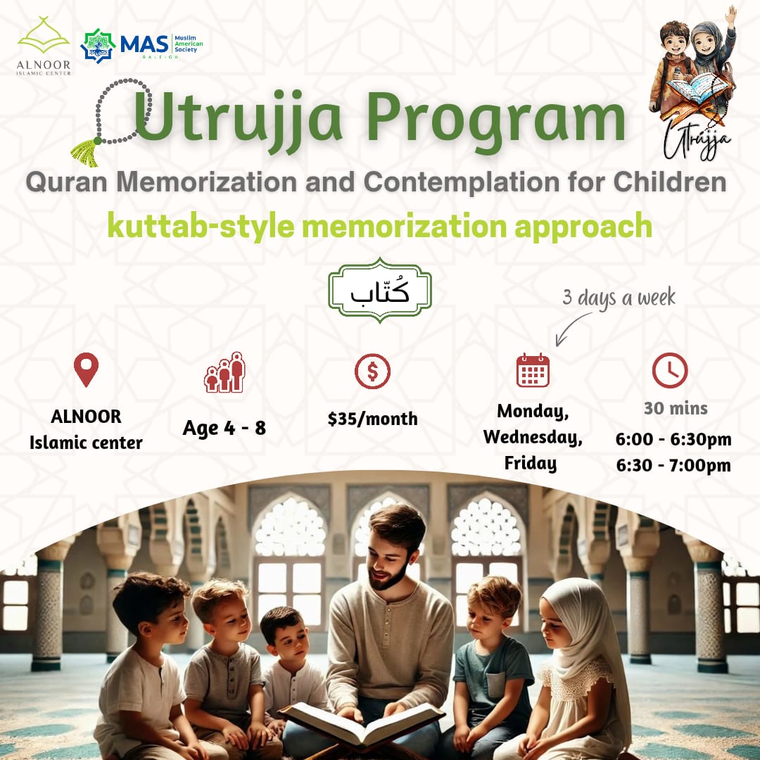 This registration is for the age group 4-8 years old (Kotab-style approach); For this age group, the program will follow a kotab (كُتاب) style memorization approach. Students in this age group will attend sessions for half an hour, three times per week (after school hours). During these sessions, they will memorize their assigned surahs, learn proper recitation, practical tajweed, and the correct articulation of letters (مخارج الحروف) under the guidance of the Sheikh/Teacher. Prerequisites: - Students must be 4-8 years old